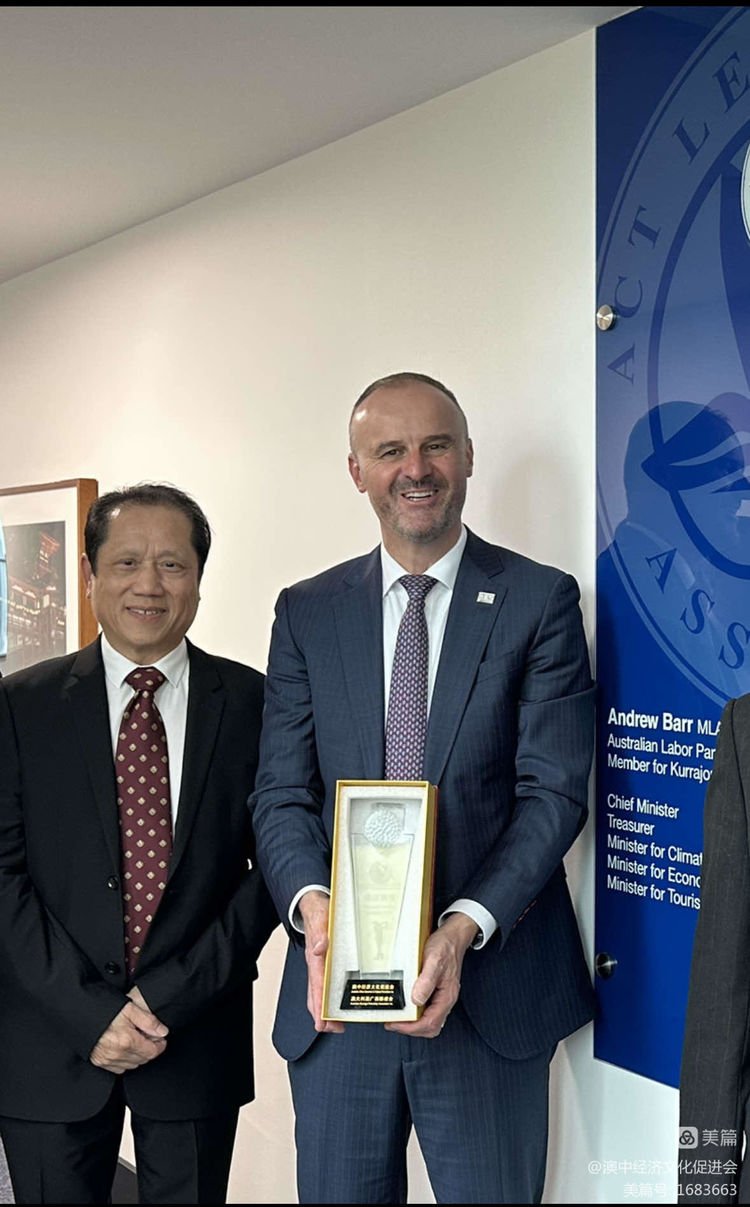 赛事的前一天,3月23日下午,首都特区首席部长安德鲁.巴尔接见了赛事组委会主席蒋德仁,并手捧赛事的特制奖杯🏆合影。