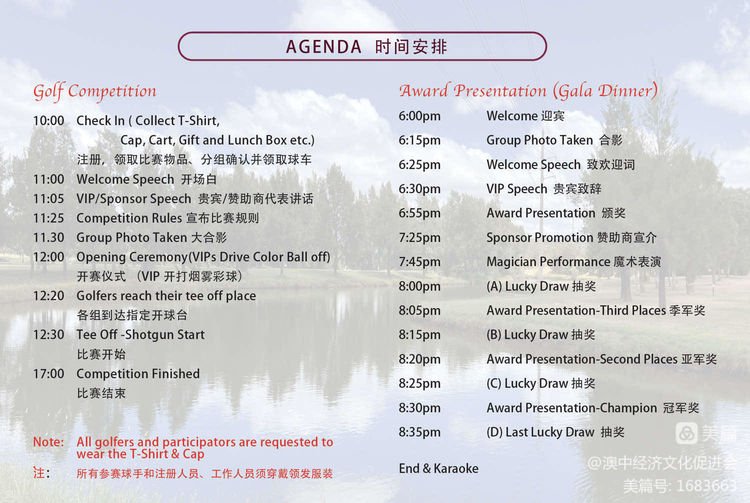 为普及和促进高尔夫运动的发展,进一步加强华侨华人与主流社会的融入和文化 交流,进一步增进高尔夫球手间的互动,更好地利用优美的自然环境和高尚的健身资 源为同胞高尔夫爱好者们服务,于 2023年 3 月24日 在澳首都堪培拉成功举办了“首届澳中友谊杯高尔夫邀请赛”。